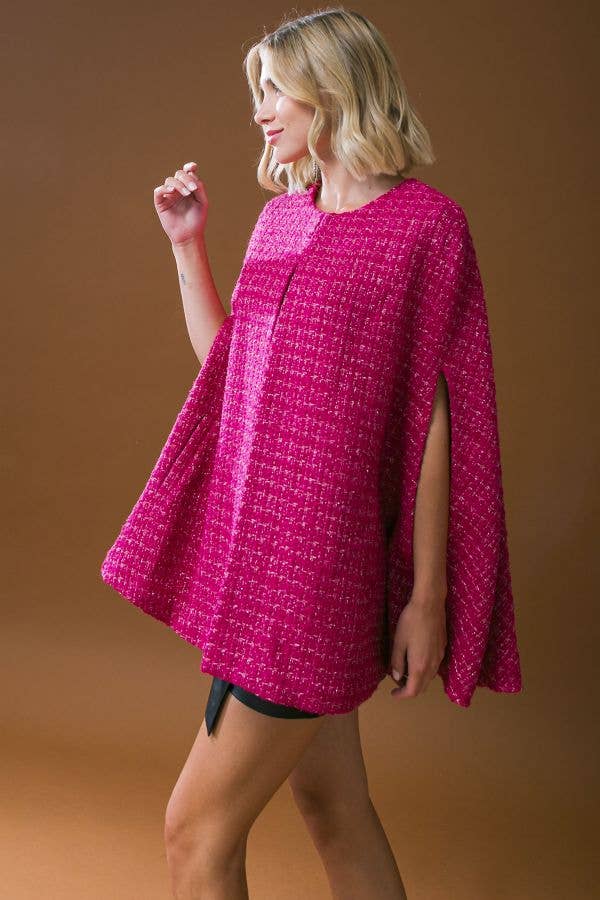 This pink tweed capelet brings a bold, elevated touch to any outfit. Designed with a round neckline, a simple front closure, and discreet side pockets, it adds effortless style while keeping your look refined. Throw it on over dresses, denim, or evening pieces for an instant statement.