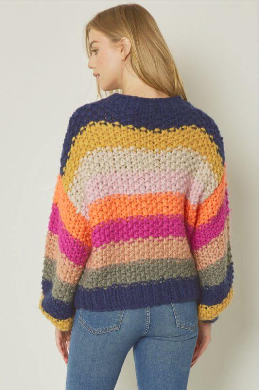 This navy stripe, colorful chunky knit gives the ultimate in cozy appeal, perfect for the wintertime! You'll feel no winter blues even in frigid temps with these cheerful bright colors! The drop shoulders and slightly oversized sleeves offer a relaxed fit and add an effortless vibe!