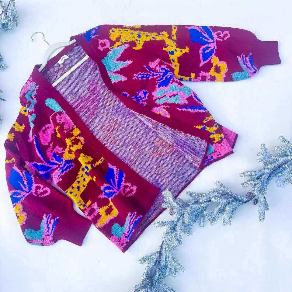 This vibrant knit is pure feel-good dressing: playful color, whimsical pattern, and just the right amount of drama. The rich berry base mixed with unexpected pops of pink, blue, and golden yellow gives it that collected-abroad, art-lover, main-character energy.
